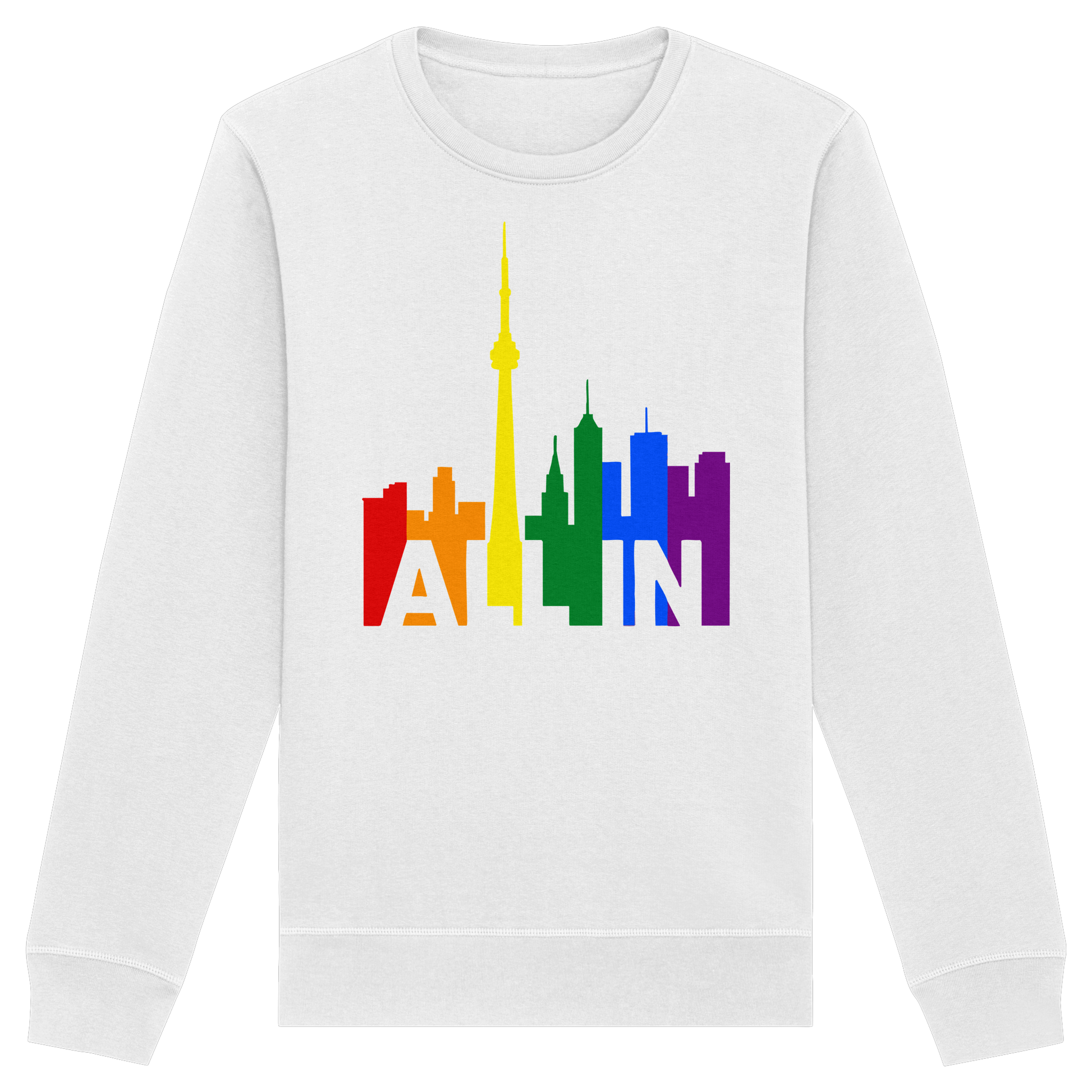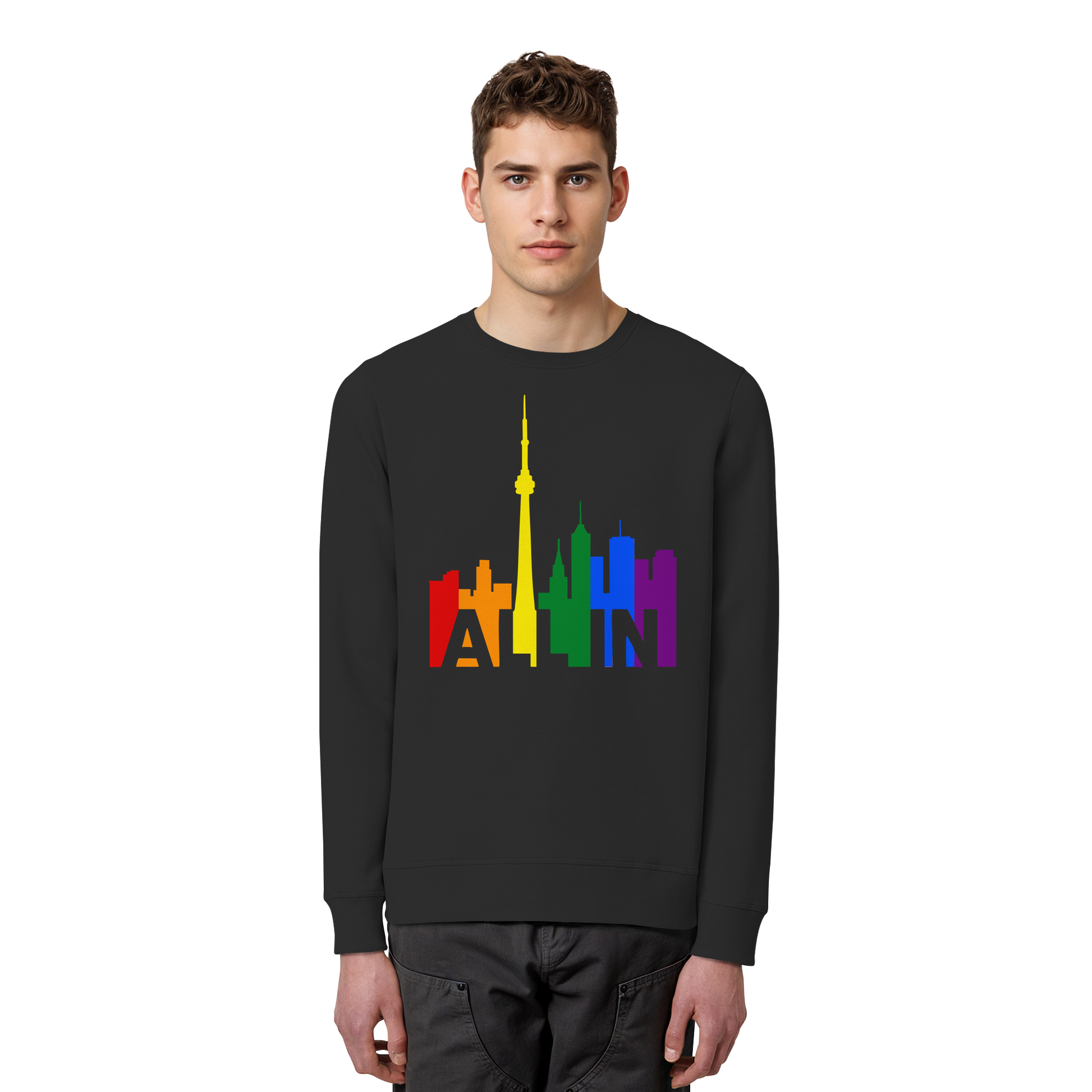 This sweatshirt brings the message of Pride into the colder months – with warmth, weight, and unshakable presence. Featuring the CN Tower and the vibrant Toronto skyline, the slogan “ALL IN” becomes your wearable declaration of identity and inclusion.