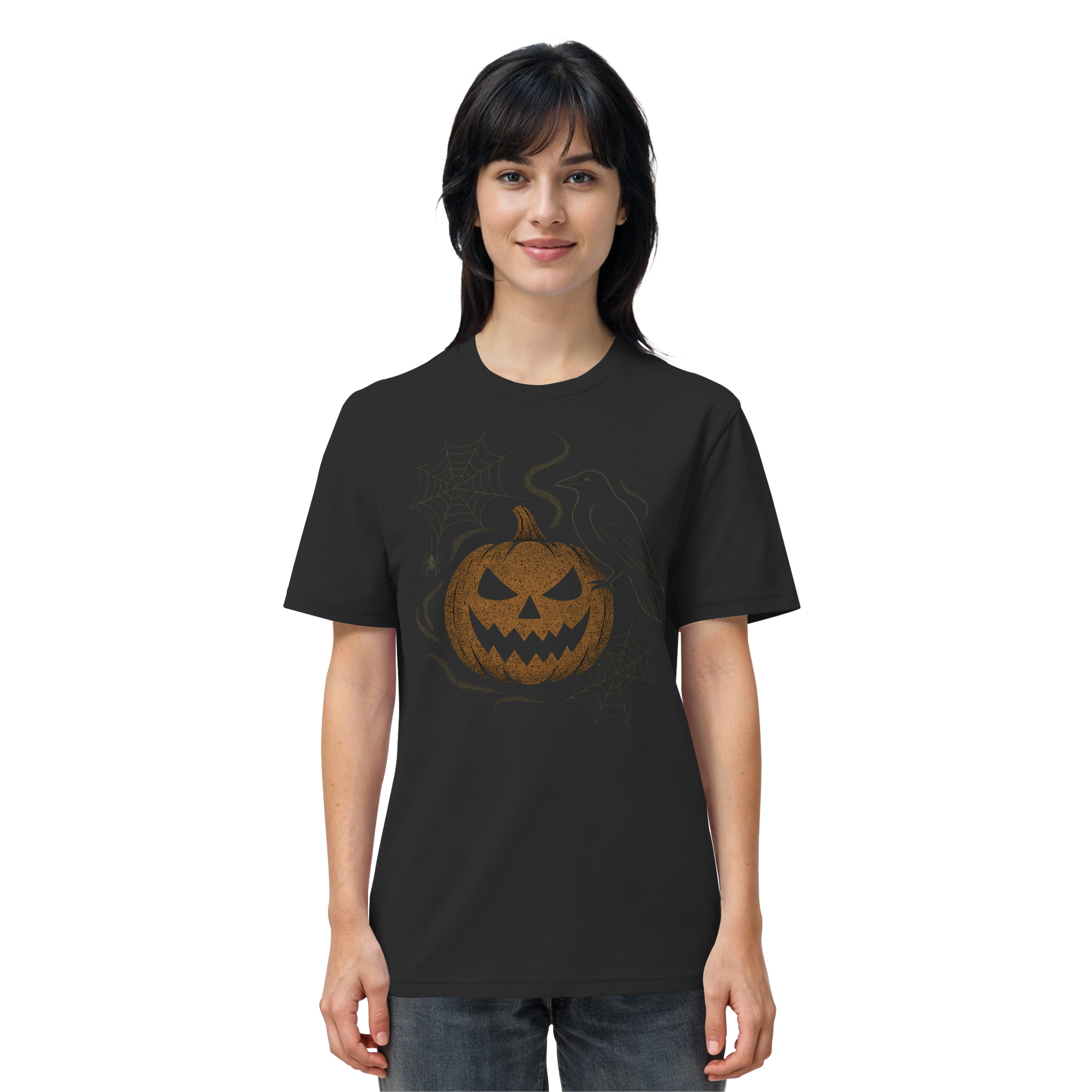 Ghostly Pumpkin blends whispering spirits with autumn’s noble decay. The jack-o’-lantern sits central, its carved grin softly glowing, as ghostly fog and curling webbed strands drape the edges. A crow silhouette watches from the side, and faint skeletal branches frame the scene.
