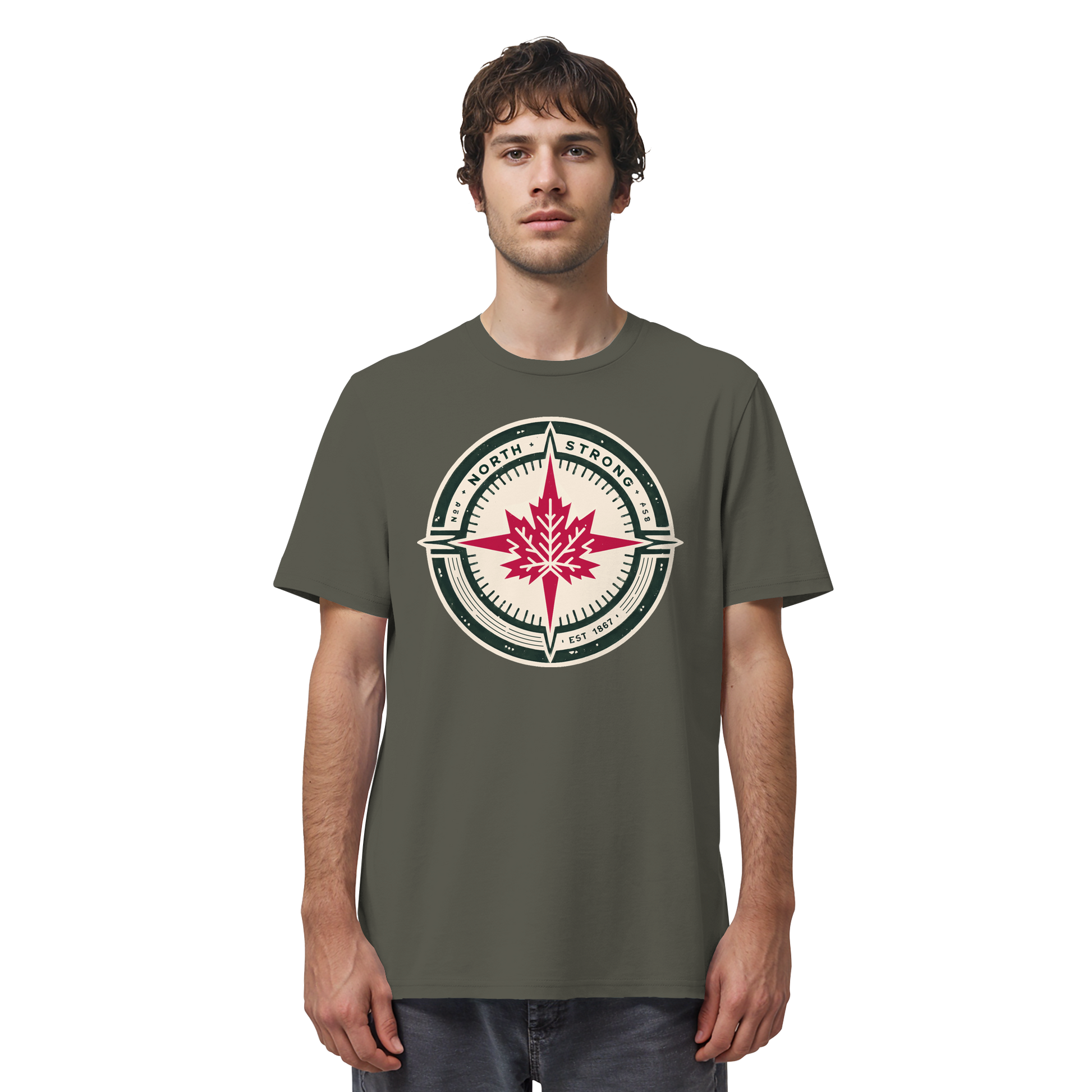 The compass features clean yet distinct cardinal points, reinforcing the sense of navigation and discovery. The words “NORTH STRONG” and “EST 1867” are rendered in a rugged, expedition-style font, adding a modern, adventurous touch. This design is available in earthy tones—deep forest green, muted beige, and slate grey - evoking the beauty of Canada’s great outdoors. For those who appreciate a lived-in, timeless aesthetic, an optional vintage fade enhances the design with a well-worn, authentic look.