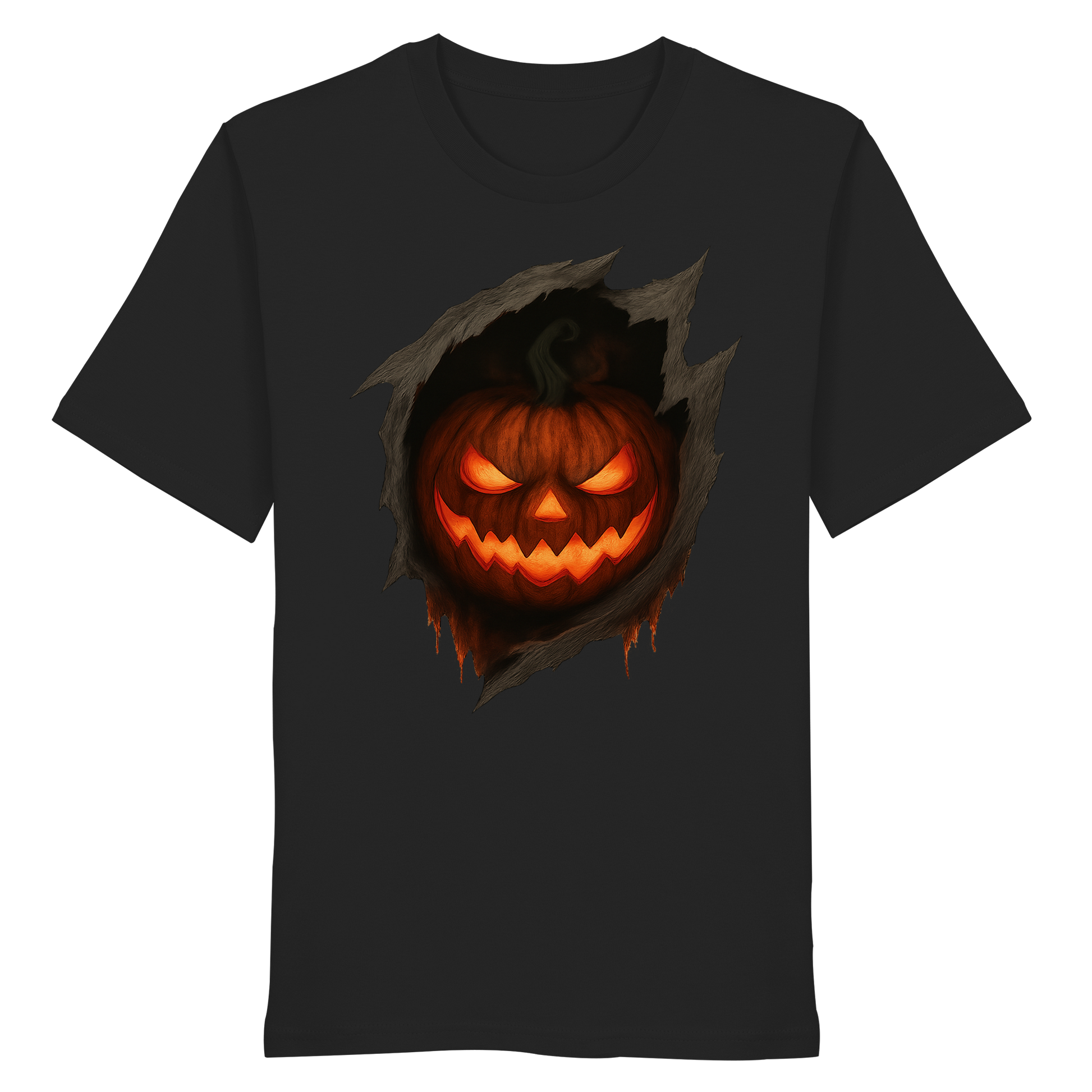 Pumpkin Core is a brutal Halloween design that strips the season down to its glowing, grinning essence. A single jack-o’-lantern dominates the scene, tearing through a pitch-black background with blazing orange eyes and a razor-sharp smile. The rip effect adds a dynamic 3D illusion, as if the pumpkin is pushing out from another dimension – furious, alive, and uncontained.